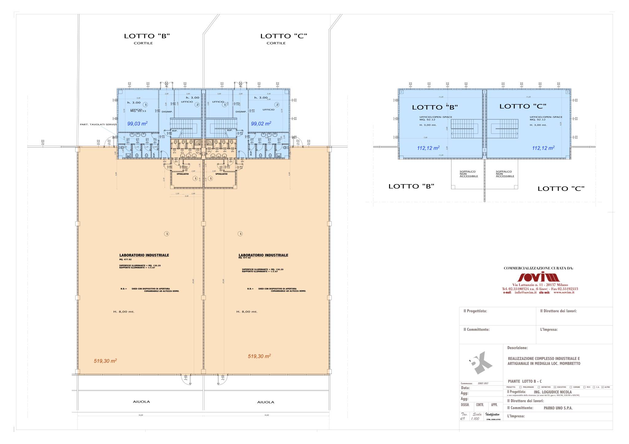 Capannone H mt. 8 sotto trave di mq. 1.040 circa più palazzina uffici su 2 livelli di mq. 420 circa.